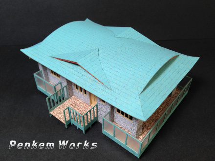 2019-08-13 h13a模型完成 ハウス製作 本日も早朝から蒸し暑い。 体調悪し。。。 個別パーツが完成して、最後にこれらを組み付ける。 ミニチュア模型/完成 屋根やバルコニーを取り付け、ガラスを入れて完成した。 上面から 下側から見上げてみる。 まだ、垂木イメージ部材は取り付けていない。。。 沢山の垂木イメージ部材を取り付けるとぐっと見栄えが上がる! 玄関部分のアップ。 次は、雪景色で撮影をしようかと。。。 ペンケム模型作品(Instagram) PenkeM作品集